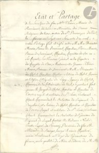 MEUSE. 18 pièces, 1685-1779 ; papier, un parchemin, environ 120 ff. Dossiers concernant les familles Mouzin de Romécourt, Hannel de Levoncourt, de Beurges… Partage de succession de Charles-François de Cholet et son épouse Jeanne-Barbe Mouzin de Romécourt (1771, 2 cahiers). Succession de Thérèse de Mouzin de Romécourt (Toul 1779). Partage des biens d’Alexandre Mouzin de Romécourt, chevalier, baron d’Issoncourt (1762). Partage de vignes provenant de la succession de Mme de Beurges, belle-mère de C.F. de Cholet (1759). Partage de la succession de François Hannel, baron de Levoncourt et de Catherine Aubertin, douairière de Dombasle (1764-1779, 9 pièces). Biens fonciers de la famille Hannel, sise à Morley…