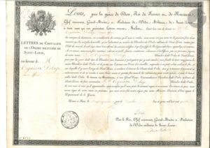 MILITARIA. 21 lettres ou pièces, 1814-1847 ; 2 sur parchemin. Brevets et diplômes, nominations, états de services pour Joseph Ernest Cognasse de Lage (1772-1848). Lettres de chevalier de l’Ordre militaire de Saint-Louis (1815, avec le protocole ms). Certificat de service dans l’Émigration, signé par Louis-Joseph de Bourbon, prince de Condé (1816). Certificats et nominations, avec signatures du duc de Feltre, Soult duc de Dalmatie, le comte de Vaugiraud, Gouvion Saint-Cyr, le marquis de Clermont-Tonnerrre…