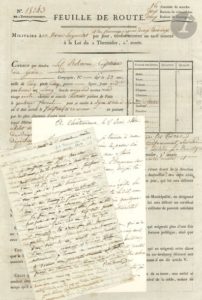MILITARIA. 15 lettres ou pièces concernant Jacques Robineau de Bougon, capitaine du Génie. On joint une L.S. du maréchal Soult duc de Dalmatie au capitaine Sempé (1841). 2 lettres adressées à Robineau de Bougon, dont une du 23 juin 1791 : « nous avons appris la grande et facheuse nouvelle de l’évasion du Roy. Le bruit qu’on fait courir en même tems des désordres qui se passent à Paris [...] La guerre civile s’approche à grand pas […] elle sera vive j’espère neanmoins qu’elle ne sera pas longue »… Certificat de résidence, Châlons (Marne) 17 septembre 1792. L.S. du général Saint- Fief, 2 avril 1793. Laissez-passer délivré par la municipalité de Libre sur Sambre, 22 vendémiaire IV. Ordre de mission signé du général Picot de Bazos, Sedan 3 brumaire IV. L.S. par le général Milet-Mureau, 18 ventôse IV. 5 feuilles de route, 1796. 2 L.A.S. du général Bertrand, 1803 (avec brouillon de réponse de Robineau) et 1842. On joint une L.S. du maréchal Soult duc de Dalmatie au capitaine Sempé (1841).