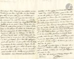 Les lettres sont écrites durant les absences du baron d’Arlincourt, et donnent un vivant aperçu de la vie d’une famille d’officiers vivant dans le palais Acton, à Naples, sous le règne de Murat, et des événements qui la ponctuent : vie de la Cour, relations avec Caroline Bonaparte et Murat, éruption du Vésuve, trahison de Murat, etc. Nous ne citerons que 3 lettres, bien représentatives de cet ensemble. 6 septembre 1811, lors du voyage de Charles avec Caroline Bonaparte à Paris. « Je te l’avoue, mon cher Charles, la seule chose que je désire c’est que tu ne reviennes qu’avec la Reine, tu es partie avec elle, tu dois revenir avec elle [...]. Ma position ici n’est pas gaie, mais je suis consolée par l’idée que tu es auprès de la Reine, que tu peux lui être utile, et c’est pour moi beaucoup, que tu puisses lui montrer notre attachement ; tout mon désir est qu’elle me continue ses bontés et me fasse venir près de toi [...]. Le maréchal Pérignon est arrivé hier matin, il a été au désespoir de n’avoir point vu la Reine, tu sais combien il lui est attaché, il est toujours bon comme à son ordinaire. Le Roi l’a très bien reçu, comment serait-il possible d’accueillir mal un si brave homme ? [...] J’envoie à la Reine plusieurs éventails, il n’en reste plus que trois pour que tous ceux qu’elle m’a dit de faire faire soient terminés ; je lui ferai passer par une autre occasion, il y en a toujours. [...] Je ne puis trop te le répéter, c’est ta conduite à Paris qui peut tout faire sur notre avenir ; tu diras ma femme est une rabâcheuse, mais je te connais tu es si bon [...]. Caroline et Achillina [leurs filles] se portent à merveille ; Caroline est gentille à croquer, elle louche beaucoup moins depuis ton départ [...]. Dis à Mme Exelmans que son époux est l’exemple des maris, il ne pense qu’à elle, et c’est bien naturel, il est tous les soirs couché à onze heures, il ne va jamais au spectacle, il vient quelques fois nous voir le soir ; hier maman et moi nous avons été à la Villa Reale où il faisait un beau clair de lune, nous avons bien parlé d’Amélie. Le Roi la traite fort bien »... 28 décembre 1813, sur l’éruption du Vésuve. « Je te dirai que le Vésuve nous donne depuis deux jours un spectacle beau, mais vraiment effrayant ; le jour de Noël à six heures du soir, l’éruption a commencé, le vent de tramontane avait régné toute la journée et le Vésuve avait été couvert d’un nuage noir et épais ; lorsque la nuit est arrivée, ce nuage s’est changé en feu, et s’étendit par la force du vent à une hauteur prodigieuse ; ajoute à cela les détonations qui faisaient tout trembler ; cette belle horreur a duré environ deux heures, le vent s’est calmé, la lave coulait toujours mais sans fréquentes éruptions ; la nuit a été fort tranquille. Le lendemain, le tems était très beau lorsque je me suis levée ; j’ai déjeuné à dix heures et je me suis mise à lire ; il y avait à peu près une demie heure que je lisais lorsque je crus entendre un coup de canon, je me levai et j’allai sur ma terrasse pour savoir si ce n’était pas un bâtiment qui entrait dans le port ; il n’y avait rien ; mais en me retournant du côté du Vésuve, je vis dans le même moment s’élever un nuage qui s’étendit avec une telle rapidité qu’en un quart d’heure il est venu nous jeter des petites pierres jusqu’à Ste Lucie. Le beau soleil a été obscurci en entier, les détonations qui nous avaient paru fortes la veille n’étaient rien en comparaison de celles du lendemain ; les vitres du gai Domon ont été cassées et dans nôtre palais noms avons eu l’idée de ce que peut être un tremblement de terre. Je t’assure que c’était très effrayant et si cela eut duré un peu plus, tous les habitants de Portici et de la terre arrivaient à Naples. Le Roi a été obligé d’y aller pour calmer les esprits ; il n’y avait rien de plus singulier que de voir la route de Portici couverte de ces malheureux, qui portoient leurs chaudrons, leurs marmites, leurs couvertures, leurs matelas, et leurs enfants de l’autre côté »... 12 et 22 janvier 1814, après la trahison de Murat, qui s’est allié à l’Autriche : « le Roi a conservé son royaume en traitant avec les ennemis ; le comte de Mier est arrivé hier soir et le maréchal Pérignon part dans vingt quatre heures. Je suis femme, mon ami, je n’ai donc d’autres conseils à te donner que de te dire, de lire ta patente