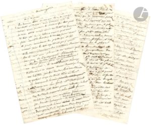 [NAPOLÉON Ier]. Jean-Marie BAZIN (1815- ?) enseigne de vaisseau sur la Belle-Poule. L.A.S., Cherbourg [début décembre 1840], à sa mère ; 12 pages in-8. On joint 3 documents imprimés de l’époque sur le retour des cendres : chansons et éloge funèbre. Longue lettre, faisant le récit de son voyage à Sainte-Hélène pour aller chercher les cendres de Napoléon. Il raconte la halte à Bahia où le prince de Joinville a voulu faire une partie de chasse et a été attaqué, puis l’arrivée à Sainte-Hélène, la visite à Longwood : « Tout a été dégradé d’une manière honteuse pour la nation anglaise. Ils ont fait une mauvaise ferme d’une habitation qu’ils auraient dû bruler pour ensevelir dans les flammes une partie de leur ignominie. La chambre de l’empereur est devenue une écurie »… Puis c’est l’exhumation de Napoléon : « on a procédé à l’ouverture : et oh prodige étonnant après avoir ouvert les trois cercueils […] on trouvé l’empereur Napoléon lui-même, dans le même état qu’il y avait été déposé il y a vingt ans […] Tout donc était intact la figure les mains les vêtements car il était en gd uniforme ». Puis c’est l’embarquement et le retour jusqu’à Cherbourg… On joint 3 documents imprimés de l’époque sur le retour des cendres : chansons et éloge funèbre.