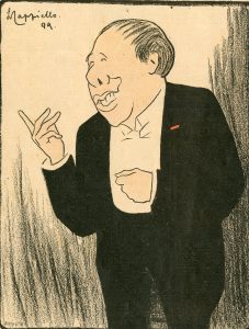 Ensemble de 7 caricatures lithographiées en couleurs, extraites du journal humoristique "Le Rire". P., 1899-1901, dim. : (7 x) 30,5 x 23 cm. Caricatures de : "Coquelin Cadet", "Polaire à la Scala", "Marguerite Deval", "Yvette Guilbert", "Méaly à Parisiana", "Mlle Jeanne Granier et M. Albert Brasseur" (reproduction de l'affiche pour les vins Segol Fils) et "Une gloire ancienne : Jacquelin".