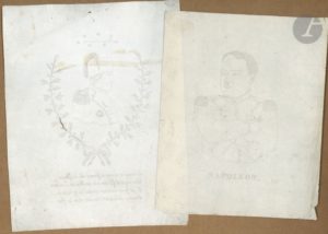 [NAPOLÉON Ier]. 2 portraits réalisés à l’aiguille sur papier, milieu XIXe s. ; 1 page …
