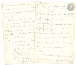 Robert d’ORLÉANS, duc de CHARTRES (1840-1910), petit-fils de Louis-Philippe, militaire ; il fut autorisé à participer à la guerre de 1870 après la chute de l’Empire et servit (sous le pseudonyme de Robert Le Fort) comme chef d’escadron dans l’armée de la Loire ; colonel en 1878, puis exilé en 1886. L.A.S., Campement de N’Gaouss 9 septembre [1871], à l’ancien député Louis-Charles Estancelin (1823-1906) ; 8 pages in-8. Belle lettre d’Algérie. Robert d’Orléans, « chef d’escadron aux 3e Chasseurs d’Afrique », rappelle à Estancelin que c’est à son intervention qu’il doit de pouvoir « servir régulièrement » son pays. Après avoir passé quinze jours à Constantine, il a « reçu l’ordre de rejoindre avec un convoi la colonne du gal Saussier, une de celles qui a le plus fait, puisqu’elle a eu depuis 6 mois 28 engagements. […] J’ai le commandement de 2 escadrons du régiment. Je vis en bon camarade avec tous les officiers et j’ai la conscience tranquille de faire mon devoir quelque pénible qu’il puisse être par moments ». Il raconte un engagement « dans lequel nous avons flanqué une bonne pile à Achmed bey et à ses insurgés. Il y en a eu une centaine sur le carreau. On dit même des femmes – les gourbis, les tentes ont été brulés – les troupeaux rasés. C’est très cocasse un combat arabe – […] une pétarade épouvantable, on entend siffler quelques balles, tout le monde tire de tous les côtés, on croit qu’il n’en restera pas un et au fond généralement le soir on se retrouve en bonne santé. […] En somme l’Insurrection tire sur sa fin – quand Bou Mezrag sera rendu ou en fuite ce sera fini dans la province sauf le Sud où il faudra faire une expédition vers Xbre. […] J’ai retrouvé le buste de mon père à Sétif – partout beaucoup de souvenirs de l’oncle Aumale – surtout les Arabes lui sont restés attachés. Les journaux de la province sont plus ou moins communeux, à peu près comme les colons, ont beaucoup crié contre ma venue, contre ma nomination extra légale »… Etc.