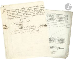 SAINT-DOMINGUE. 3 P.S., Le Trou, Le Cap (Saint-Domingue), 1777-1789 ; 3 pages petit in-4. L’habitation du grand-oncle d’Alexandre Dumas. [Né en 1716, Charles Davy de La Pailleterie s’installa à Saint-Domingue où il cultiva le tabac, la canne à sucre et l’indigo. De retour en France, il monta, en 1760, une société de commerce triangulaire. Ayant renoncé à cette activité après deux traversées décevantes, il retourna à Saint-Domingue où il mourut en 1773, laissant des habitations grevées d’un lourd passif successoral. Sa fille, Marie Anne Charlotte, hérita de ses propriétés qui furent alors dirigées par son mari, Léon de Maulde. Charles était le frère d’Alexandre Antoine Davy de La Pailleterie, le grand-père d’Alexandre Dumas.] Les deux premiers documents sont des factures de sucre signées par le gérant de l’habitation, par Maunoury de Prémesnil : « Facture d’une barrique de sucre terré provenant des habitations de M le comte de Maulde, chargée par M de Prémesnil sur le navire le Sylvain, Capne Jean Morel de Dunkerque [...] à l’adresse et consignation de M Elle Briansiaux, négociant à Dunkerque »… (Le Trou 17 juin 1777). – « Facture de vingt barriques de sucre blanc terré [...] chargées par M de Prémesnil sur le navire le Basque, Capne Lermet [...] à l’adresse & consignation de MM Antoine Defos & Cie négociants à Bordeaux »... (Le Trou 16 juin 1783). Le troisième est un connaissement signé par un capitaine de navire marchand : « Je Chebaud capitaine & maître, après Dieu, du navire nommé le St Honoré de Nantes, ancré à présent devant le Cap français [...] confesse avoir reçu [...] les marchandises suivantes, nombrées et marquées [... ], savoir : Vingt-quatre barriques créoles sucre terré [...] à l’adresse & consignation de M Prosper Charret, négociant à Nantes... » (Le Cap 5 avril 1789).