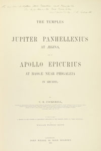 Frontis + dedicatoria ilustr. + X + 94 p. + 39 lám. Profus. ilustr. con bonitas viñetas en el texto y lám. de alzados, secciones, plantas, planos, detalles arquitectónicos y excavaciones de los templos de Júpiter, Apollo y Phigaleia; 3 de las lám. iluminadas a mano, una plegada y un fotograbado laminado. Foxing muy ocasional. Enc. con la lomera en piel y tela, rozada. Dedicatoria autógrafa manuscrita. Primera y única edición de la documentación de las campañas arqueológicas realizadas por Cockerell junto a su amigo Haller von Hallerstein. Reputado arquitecto de la alta sociedad Británica construyó multitud de edificios, culminando su carrera como Presidente del Real Instituto de Arquitectos Británicos en 1860. Apasionado por la cultura clásica, viajó a Roma y Grecia varias veces, realizando trabajos arqueológicos de documentación. En uno de estos viajes descubrió el friso del templo de Apolo en la antigua ciudad griega de Basas, conservado actualmente en el Museo Británico.