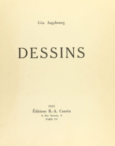 ---1931---. LIBRO: ---(ARTE)---. ---AUGSBOURG, GÉA:--- ---DESSIBS---. Paris: Ed. R. A. Corrêa, 1931. 4º mayor. 8 h. + 29 lám. Edición numerada de 200 ejemplares. En rama, presentado una funda, algo sucia y con pequeñas rasgaduras.