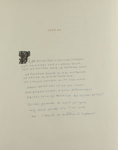 Retrato de Dante en frontispicio y 5 lám. II: Purgatori, 532 p. + 4 lám. III: Paradís, 572 p. + 4 lám. Texto a dos tintas. Iniciales grabadas al boj dibujadas y ejecutadas por Ricard Marlet. Presentado en rama, con carpeta y petaca. Edición limitada de 33 ejempales numerados en romana, cada parte con la firma y un canto manuscrito del traductor.