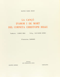 ---1965---. LIBRO: ---(BIBLIOFILIA)---. ---RILKE, RAINIER MARIA:--- ---LA CANÇÓ D´AMOR I DE MORT DEL CORNETA CHRISTOPH RILKE.--- Trad. Carles Riba. Prólogo de Salvador Espriu. Barcelona: Graphic Andros, 1965. 4º menor. 93 p. + 2 h. + Ilustr. con...