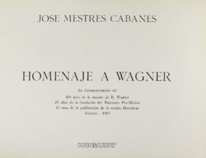 ---1982---. LIBRO: ---(BIBLIOFILIA)---. ---MESTRES CABANES, JOSÉ:--- ---HOMENAJE A WAGNER EN COMNEMORACIÓN DE: 100 AÑOS DE LA MUETE DE R. WAGNER.--- Barcelona: Ed. Monsalvat, 1983. Folio mayor, apaisado. 12 pliegos, en rama, con cromolitografías...