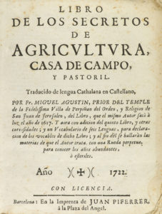 ---1722---. LIBRO: ---(AGRICULTURA)---. ---AGUSTIN, MIGUEL:--- ---LIBRO DE LOS SECRETOS DE AGRICULTURA, CASA DE CAMPO, Y PASTORIL. Traducido de Lengua Catalana en Castellano por... Libro que el mismo autor sacó a la luz en 1717. Y ahora con...