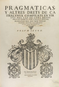 ---1588-1589---. LIBRO: ---(DERECHO CATALÁN)---. ---CONSTITUTIONS Y ALTRES DRETS DE CATHALUNYA 1585.--- Barcelona: Hubert Gotart (en colofón), 1588-1589. Folio. 26 p. + 584 p.+ 18 p. [Sigue: ] ---PRAGMATICAS Y ALTRES DRETS DE CATHALUNYA COMPILATS...