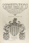 EN VIRTUT DEL CAP DE CORT XXIIII (...) ---B.: 1589. 2 h. + 171 p.+ 3 h p. (de 4) [Sigue:] ---LIBRE PRIMER DE LAS CONSTITUTIONS DE CATHALUNYA SUPERFLUAS, CONTRARIAS Y CORREGIDAS. ---2 h. + 72 p. Obra en tres partes. Completa con tres portadas, la primera facsímil, y las 20 primeras hojas mal remarginadas del margen exterior. Algunas galerías restauradas, buen papel. Anotaciones manuscritas del siglo XVII en los márgenes de algunas hojas. Enc. en pergamino reciente, lomera rotulada. Primera compilación general de las leyes de Cataluña. Palau 60360.