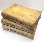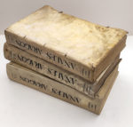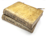 interior) II: 8 h. + 458 fol. III: 8 h. + 326 fol. IV: 8 h. + 371 fol. V: 6 h. + 351 fol. VI: 6 h. + 407 fol. [Sigue:] ---APOLOGIA DE AMBRISIO DE MORALES, CON UNA INFORMACION AL CONSEJO... ---Id., 1670. 1 h. + 31 fol. + 1 h. [Más:] ---ÍNDICE DE LAS COSAS MAS NOTABLES... ---Id.: Alonso Rodriguez, 1604. 8 h. + 747 p. + 2 h. y ---VOL II- --- Id.: Diego Dormer, 1671. 6 fol. + 747 p. Todos con las portadas a dos tintas y con grabado xilográfico de gran tamaño. Todos con capitales y culs-de-lamp xilografiados, texto a dos columnas. Amplios márgenes, buen papel. El primer vol. del Índice presenta una restauración en la portada, sin pérdida. El resto muy limpios, solo algo de humedad puntual y marginal en los vol. IV y VI. Todos en enc. uniforme de pergamino de época, excepto vol. I y IV donde el pergamino es algo posterior, todos con la lomera rotulada. Conjunto completo de la edición que siguió a la de Lorenzo de Robles y además lleva los índices (el de 1604 y el de 1671). Palau para cada vol.: 381763, 381764, 381761, 381766, 381767, 381768, 381772.