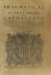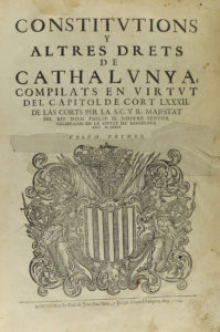 Joseph Llopis Estampers, 1704. 3 partes en 2 vol. en folio mayor. I: 22 h. + 513 p. + 1 h. en blanco + 22 h. Repertori Alphabetic. Pequeña galería en el margen inferior de algunas p. centrales, no afecta texto. II: 2 h. + 213 p. + 3 h. + 2 h. + 90 p. + 1 h. de erratas. Cada una de las tres partes con portadas propias y con un gran escudo de Catalunya xilografiado. Conserva todos los márgenes. Algo tostado con esporádicos puntos de óxido. Enc. en medio pergamino de época, lomera rotulada, cantos inferiores restaurados. Ex-libris de anterior poseedor. Edición original de esta compilación de las Constituciones de Catalunya. Fue impreso cuidadosamente en grueso papel con un magnífico diseño de las capitulares (de diferentes tamaños), texto a dos columnas. Anotaciones manuscritas marginales. Palau 60361, dice que esta es la edición más buscada por los estudiosos, por ser la más completa, la dificultad de hallarla impulsó al Colegio de Abogados a editar un facsímil en 1909. Es además, el libro más voluminoso publicado en lengua catalana hasta la fecha. Aguiló 1321.