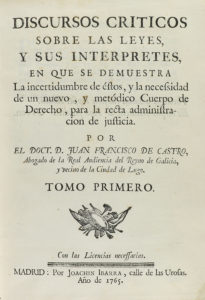 ---1765---. LIBRO: ---(DERECHO)---. ---CASTRO, FRANCISCO DE:--- ---DISCURSOS CRITICOS SOBRE LAS LEYES Y SUS INTERPRETES, EN QUE SE DEMUESTRA LA INCERTIDUMBRE DE ESTOS, Y LA NECESIDAD DE UN NUEVO, Y METÓDICO CUERPO DE DERECHO...--- Madrid; Imp....