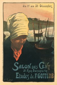 "Concerts Ysaÿe" (1896). Lithographie en couleurs signée dans la planche. Reproduction de l'affiche parue dans les planches de "Les Maîtres de l'Affiche". P., Impr. Chaix, 1896, dim. support : 40 x 29 ; sujet : 31 x 23 cm, timbre à sec de l'éditeur (pet. manques marg.)./ GOTTLOB (Louis). "Salon des Cent" (1899). Lithographie en couleurs signée dans la planche. Reproduction de l'affiche parue dans les planches de "Les Maîtres de l'Affiche". P., Impr. Chaix, 1899, dim. support : 40 x 29 ; sujet : 35 x 23,5 cm, timbre à sec de l'éditeur./ Ens. 2 pièces.
