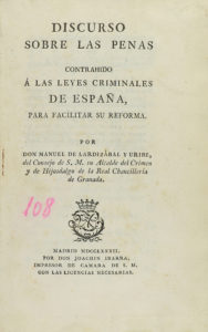 ---1782---. LIBRO: ---(DERECHO-ESPAÑA)---. ---LARDIZABAL Y URIBE, MANUEL:--- ---DISCURSO SOBRE LAS PENAS CONTRAHIDO A LAS LEYES CRIMINALES DE ESPAÑA PARA FACILITAR SU REFORMA.--- Madrid: Joachin Ibarra, 1782. 8º. 1 h. + XIV + 293 p. Capitales...