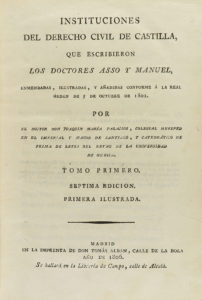 en pasta española, tejuelo. Lomera tomo I con pequeña falta en la parte inferior, puntas rozadas. Marca manuscrita de anterior poseedor en ambas portadillas. Última edición de esta obra, completamente renovada por Joaquín María de Palacios, presenta por ello gran cantidad de adiciones al texto original de Asso y Manuel.