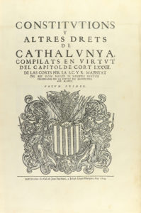 Henrich y Cia., per acord de la Junta de Gobern del M.I. Col.legi d´Advocats de Barcelona, 1909. Folio menor. Facsímil de la edición de Joan Pau Martí y Joseph Llopis, de 1704. Folio. 22 h. + 513 p. + 22 h. [Seguido de:] PRAGMATICAS Y ALTRES DRETS DE CATHALUNYA... novament reimpresas conforme la disposició del Capítol LXXXII de las Corts celebradas en el Ciutat de Barcelona... 2 h. + 213 p. + 3 h. [Seguido de:] CONSTITUCIONS Y ALTRES DRETS DE CATHALUNYA SUPERFLUOS, contraris y corregits, compilats en virtut del... 2 h. + 90 p. + 1 h. Enc. en un vol. en medi piel, rozada.