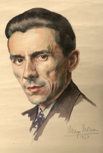 Sans titre [Portrait]. Aquarelle et crayon gras sur papier crème, datée 1937 et signée sous le portrait. Dim. support : 65 x 50 cm ; sujet : 31 x 21 cm (qq. plissures).
