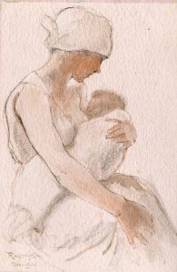"Maternité" (1921). Encre et lavis sur papier teinté, datée et signée au coin infér. gauche. Dim. support et sujet : 20 x 13,5 cm.