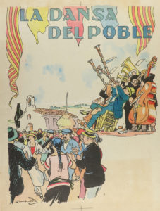 ---1930 ca.--- GRABADO: ---JUNCEDA---. ---LA DANSA DEL POBLE.--- Litografía coloreada, firmada por Junceda. Original de portada con marcas para los márgenes de la impresión. Representada una cobla de sardanas tocando para un grupo de personas...