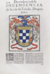 CASTILLA. SACADA DE UN LIBRO MUY ANTIGUO ESCRITO DE MANO CON LETRAS DE LOS GODOS, POR RELACIÓN DELOS MISMOS QUE LO VIERON, Y DE MUCHAS ESCRITURAS Y PRIVILEGIOS ORIGINALES DEL MISMO EMPERADOR, Y OTROS.--- Madrid: por Luis Sanchez, 1600. Folio.4º mayor. Impreso sobre papel grueso y de calidad. 12 h.+ 491 p. En la portada luce el escudo real grabado en madera e iluminado. 16 grandes grabados en madera de escudos heráldicos, iluminados en vivos colores de la época. Bellas letras capitales xilográficas. Pergamino original conservando las correillas de los cierres. Rotulación moderna. Primera edición. Precioso ejemplar de esta importante crónica que termina en la página 186, y a continuación las genealogías y escudos heráldicos grabados en madera e iluminados en vivos colores, de los nobles españoles de las siguientes familias: [1] Descendencia de la casa de Sandoval, Duques de Lerma; [2] casa de Osorio, Marqueses de Astorga; [3] casa y familia de Acuña, Condes de Valencia, y de Buendia; [4] casa de Belasco, Condestable de Castilla; [5] casa de castro, Conde de Lemos; [6] casa de Zuñiga, Condes de Miranda; [7] casa y familia de los de Guzman, Señores del Castillo de Aviados, y Toral; [8] casa de Haro, señores de Vizcaya, apellido de Haro, y origen de los Mendoza; [9] casa de Mendoça; [10] casa del infantado, y otras; [11] casa de los Manriques de Lara, Duques de Najara; [12] casa de padilla, Adelantado mayor de Castilla; [13] casa de los Ponce de Leon, Duques de Arcos; [14] casa de Quiñones, Condes de Luna; [15] casa de Toledo, Duques de Alva; [16] casa de Tovar, Marques de Berlanga. Siguen dos hojas manuscritas del s.XVII, que contienen: Casas y Apellidos que trae esta história (con el número de página). Palau 297139.
