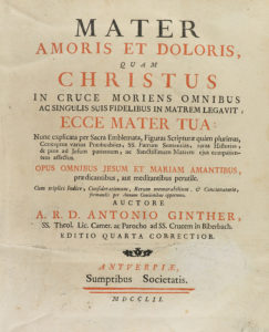 ---1752.--- LIBRO: ---(EMBLEMAS)---. ---GINTHER, ANTONIO:--- ---MATER AMORIS ET DOLORIS QUAM CHRISTUS IN CRUCE MORIENS [...] NUNC EXPLICATA PER SACRA EMBLEMATA, FIGURAS SCRIPTURAE.--- Antuerpiae: Sumptibus Societatis, 1752. 8º mayor. 13 h. (incluida...