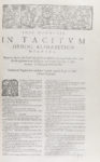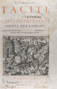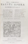 Paris: Petri Chevalier, 1608. Folio. 12 h. + 276 p. + 708 p. 78 h. + 151 p. Portada remarginada a dos tintas con bella calcografía por Gaultier, 1608. Cabeceras, capitales y culs-de-lampe xilográficas. Texto a una y dos columnas con apostillas marginales, texto en latín y griego. Pequeñas restauraciones profesionales en los márgenes. Tres partes, completo; los comentarios con portada propia, con bonita xilografía. Lomera en piel, con dorados. Ejemplar firmado por antiguo propietario, Francisco Xavier Conde (s.XVIII). Pequeñas anotaciones de época. Excepcional recopilación de la Historia de Tácito. CCPB 205488-4.