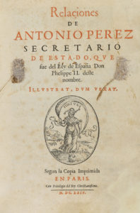 ---1624---. LIBRO: ---(HISTORIA)---. ---RELACIONES DE ANTONIO PEREZ, SECRETARIO DE ESTADO, QUE FUE DEL REY DE ESPAÑA DON FELIPE II DESTE NOMBRE.--- Paris: s.i., 1624. 4º menor. 12 h. + 263 p. (numeradas 163 por error de paginación) [Sigue:]...