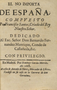 ---1668---. LIBRO: ---(USOS Y COSTUMBRES-MADRID)---. ---SANTOS, FRANCISCO:--- ---EL NO IMPORTA DE ESPAÑA. Compuesta por...--- Madrid: Por Domingo Garcia Morràs, 1668. 8º menor. 8 h. + 269 p. Cabeceras y capitales xilografiadas. Enc. en pergamino...