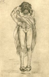 "Vachère". Gravure en noir tirée sur Japon, monogrammée dans la planche et montée sous passe-partout et cadre en bois. Monogramme apocryphe au crayon rouge. Dim. cadre : 32 x 25 cm ; sujet : 11 x 7 cm. Debout de face, en sabots et mal peignée, la petite vachère, troussée jusqu'aux épaules, regarde curieusement son ventre (Exsteens, 733 ; Rouir, 450).