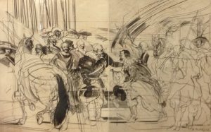 "Velasquez". Eau-forte originale en 2 tons tirée sur papier vélin, just. 47/100, signée au crayon et montée sous passe-partout brun et cadre noir en alu. Dim. cadre : 69,5 x 99,5 cm ; sujet : 49 x 79 cm (lég. mouill. au passe-partout).