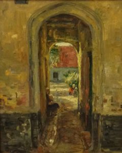 "Porche à Nieuport". Huile sur toile, signée au coin infér. droit, montée sur châssis et cadre doré en bois. Dim. cadre : 62 x 54 cm ; sujet : 45 x 37 cm (accroc dans la partie supér.).