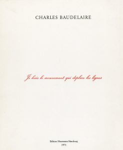 Charles Baudelaire. Je hais le mouvement qui déplace les lignes. Hamburg, Hossmann, 1973, 4°, 16 p., couv. impr. en rouge et noir. Edit. orig. tirée à 328 ex. num. 1/300 non num. Etat neuf. Ce livre trouve son origine dans un séminaire de Lucien Goldmann sur Baudelaire, tenu à Bruxelles l'hiver 1969-1970, auquel Broodthaers avait été invité à participer comme artiste (réf. Cat. Hannover, B14).