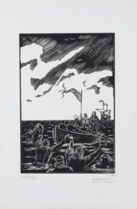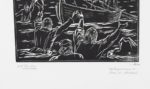 René-Yves CRESTON (1898-1964) Débarquement de Jean IV à Dinard Gravure sur bois monogrammée dans la planche, titrée, mention «1er état» et signée au crayon. Porte au dos le n° 24 en rouge. Trous de punaises aux angles et petites usures dans la marge. Dim. 50 x 32,5 cm Ancienne collection Xavier de Langlais.
