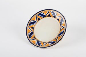 René-Yves CRESTON (1898-1964) Assiette à décor géométrique Faïence émaillée polychrome Manufacture Henriot Quimper, 1927 Signée au revers du monogramme «RYC» et «HenRioT Quimper 164» Petites usures. Diam. 24,5 cm Ces assiettes, issues du service «Populaire décor Celtique» et probablement très peu éditées voire en un seul exemplaire, ont été exposées en 1927 à l’exposition des arts appliqués de Saint-Nazaire, conçue par les Seiz Breur comme un hommage à Jeanne Malivel suite à son décès. Ces oeuvres datent d’une époque très féconde pour le couple Suzanne et René-Yves Creston, dont les travaux «à quatre mains» étaient parfois indifféremment signés par l’un ou l’autre des deux époux. Nous remercions Madame Saphyr Creston pour ses précieuses informations. Bibliographie : -Daniel Le Couédic, "l'épopée des Seiz Breur, mythe et réalité", Bretagne Culture Diversité, novembre 2016. -Bernard-Jules Verlingue, "Suzanne et René-Yves Creston", éd. Association des Amis du Musée de la Faïence de Quimper, 2001. Les dessins préparatoires de ces assiettes sont reproduits des pages 57 à 61.
