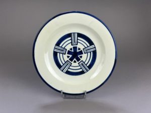 Suzanne CRESTON (1899-1979) Assiette à décor géométrique Faïence émaillée polychrome Manufacture Henriot Quimper, vers 1925. Signée au revers du monogramme «SC» et «HenRiot Quimper» Petites usures. Diam. 24,5 cm Un exemplaire similaire est conservé au musée de Bretagne à Rennes. Bibliographie : -Bernard-Jules Verlingue, "Suzanne et René-Yves Creston", éd. Association des Amis du Musée de la Faïence de Quimper, 2001. -Pascal Aumasson, "Suzanne Candré Creston à la source des Seiz Breur", éd. Locus Solus, 2023. Ensemble reproduit page 19.