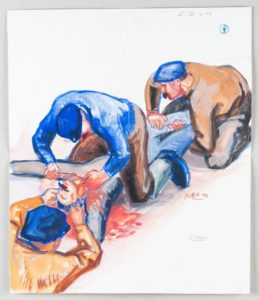 René-Yves CRESTON (1898-1964) Le blessé Gouache sur papier, 1943 Titrée, signée du monogramme «RYC» et datée «(19)43» Illustration destinée à l’ouvrage «A l’Est d’Eden» de Roger Vercel, au chapitre 2, page 42 : «Blondeau blessé». Pliée Dim. 46,5 x 40 cm Bibliographie: - Roger Vercel, «A l’Est d’Eden», éd. Arc-en-ciel, 1945