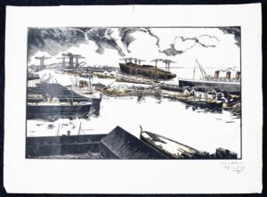 René-Yves CRESTON (1898-1964) La Construction du Normandie à Saint-Nazaire Gravure sur bois …