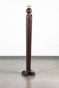 Joseph SAVINA (1901-1983) Lampadaire Chêne massif teinté au brou de noix Atelier d’Art Celtique, Tréguier, vers 1930-1935. Fût cylindrique flanqué de quatre montants et sommé d’une boule, pied cruciforme à pans coupés. Signé du monogramme «JS» de la période Seiz Breur en creux au pied Haut. 148 cm x Long. 30 cm x Prof. 30 cm Ce lampadaire illustre la diversité des influences de Joseph Savina, ici la prégnance du style Art Déco avec le jeu architectural du montage. Bibliographie : - Collectif, «Joseph Savina, l’Art et le Métier», éd. musée d’art et d’histoire de Saint-Brieuc, 1989
