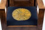Joseph SAVINA (1901-1983) Fauteuil Seiz Breur Chêne ciré, assise d’époque en tissus de la maison Le Minor Atelier d’Art Celtique, Tréguier, vers 1930-1935 Structure constituée de montants méplats en chêne massif à section en «T», assise et dossier amovibles. Haut. 90,5 cm x Long. 58,5 cm x Prof. 60,5 cm Le dossier de ce fauteuil présente un décor sculpté d’inspiration Seiz Breur, bel exemple de la création d’un répertoire décoratif «celto-moderne» par Joseph Savina. Le musée breton de Quimper conserve une chaise au décor similaire. Bibliographie : - Collectif, «Joseph Savina, l’Art et le Métier», éd. musée d’art et d’histoire de Saint-Brieuc, 1989 - Philippe Le Stum (dir), «Quimper Cornouaille années 1920-1930», éd. Palantines, 2010 - Yves Brand’honneur et Pascal Aumasson «Savina Le Corbusier, de l’art celtique à la sculpture moderne» éd. Locus Solus, 2021