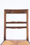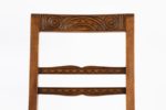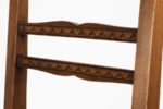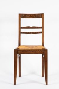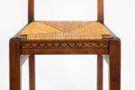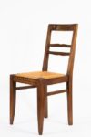 Robert MICHEAU-VERNEZ (1907-1989) Paire de chaises Hêtre massif à patine claire, sculptée à la main à la gouge et au ciseau. Petites usures. Circa 1935 Haut. 87 cm x Long. 41 cm x Prof. 37 cm On sait peu de choses sur le mobilier créé pour l’édition par Robert Micheau-Vernez. Les décors caractéristiques des Seiz Breur le rendent néanmoins très reconnaissable, ses meubles sont en effet souvent ornés d’une frise de dents de loup et d’un soleil rayonnant, à l’instar de nos chaises. Le musée breton de Quimper conserve une paire de fauteuils proche de ces modèles. Bibliographie : - Philippe Le Stum (dir.), «Quimper Cornouaille années 1920-1930», éd. Palantines, 2010