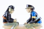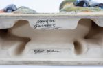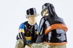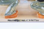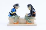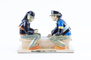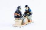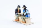 Robert MICHEAU-VERNEZ (1907-1989) Paotred ar c’hartou «Les joueurs de cartes» Groupe en faïence émaillée polychrome Manufacture Henriot Quimper, vers 1932 Titré sur la base, signé au revers «Robert Micheau» et «Henriot Quimper 145». Petites usures Haut. 23 cm x Long. 30 cm x Prof. 12 cm Il s’agit de l’un des tous premiers modèles créés par Robert Micheau-Vernez pour Henriot, il fut exposé à la galerie Saluden à Brest en novembre 1931. Notre tirage date d’avant décembre 1932. Cet instantané de vie quotidienne met en scène deux joueurs, l’un en costume de Quimper, l’autre en costume de Pont-l’Abbé, pour une partie de cartes qui restera fameuse. Bibliographie : - Philippe Théallet et Mikaël Micheau-Vernez, «Micheau-Vernez, l’oeuvre de faïence», Groix éditions, 2019. Modèle similaire reproduit p. 40.