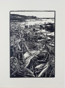 René-Yves CRESTON (1898-1964) Le partage du glaive Gravure sur bois sur papier «Mécanographie Guérinand Voiron» monogrammée dans la planche Petit trou au centre de la planche et petites taches dans la marge Dim. 43,5 x 32,5 cm