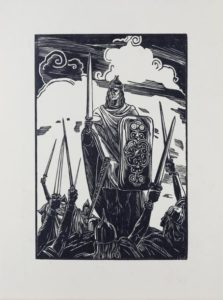René-Yves CRESTON (1898-1964) Le roi (légendaire) Gravure sur bois sur papier «Mécanographie Guérinand Voiron» sans monogramme Petites taches dans la marge Dim. 43,5 x 32,5 cm