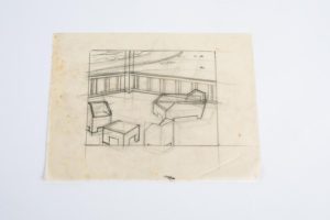 René-Yves CRESTON (1898-1964) Projet d’aménagement mobilier Crayon sur papier calque, vers 1925 Non signé Pliures, usures et rousseurs éparses Dim. 24,5 x 32,5 cm Provenance de la famille de l'artiste