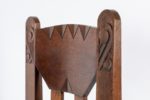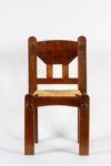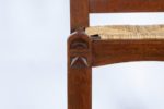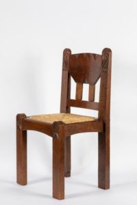 Gaston SEBILLEAU (1894-1957) Chaise Chêne patiné, assise en paille Redon, vers 1930 Structure constituée de montants méplats, les pieds avant saillants sur l’assise et sculptés de chevrons en leur sommet. La traverse supérieure du dossier de forme trapézoïdale inversée est légèrement incurvée et finement sculptée de dents de loup. Elle est jointe à la traverse inférieure par deux barreaux. Les montants du dossier formant oreilles, sculptés de volutes celtiques stylisées en leur sommet. Le paillage est rapporté, refait à l’identique du modèle original. Dim. Haut. 84 cm x Long. 45,5 cm x Prof. 37 cm Bibliographie : - Daniel Le Couedic et Jean-Yves Veillard (dir.), Ar Seiz Breur 1923-1947, la création bretonne entre tradition et modernité , ed. Terre de Brume - musée de Bretagne, 2000 - Philippe Le Stum (dir), «Quimper Cornouaille années 1920-1930», éd. Palantines, 2010 Cette chaise représente la quintessence du travail personnel de Gaston Sebilleau, ébéniste redonnais et éminent membre des Seiz Breur, qui collabora avec Jeanne Malivel et René-Yves Creston. Le musée de Bretagne et le musée breton de Quimper conservent chacun des modèles similaires.