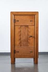 Gaston SEBILLEAU (1894-1957) Buffet en chêne massif à patine claire. Redon, vers 1930 Usures d’usage et petites tâches d’humidité Haut. 112,5 cm x Long. 60 cm x Prof. 30,5 cm Provenance de la famille de l’artiste. Bibliographie : - Daniel Le Couédic et Jean-Yves Veillard (dir), «Ar Seiz Breur 1923-1947, la création bretonne entre tradition et modernité», éd. Terre de Brume - musée de Bretagne, 2000 - Philippe Le Stum (dir), «Quimper Cornouaille années 1920-1930», éd. Palantines, 2010 Mobilier empreint d’un design presque radical, ces deux petits buffets de boiserie à hauteur d’appui et se faisant face arborent un répertoire décoratif minimaliste tout en nuance géométrique et, là encore, parfaitement maîtrisé par leur auteur. Ils incarnent l’esthétique bretonne et moderne promue par le groupe. Tout comme les autres meubles modernistes de Gaston Sébilleau que nous présentons dans cette vente, ce mobilier s’avère assez rare car relativement peu produit.